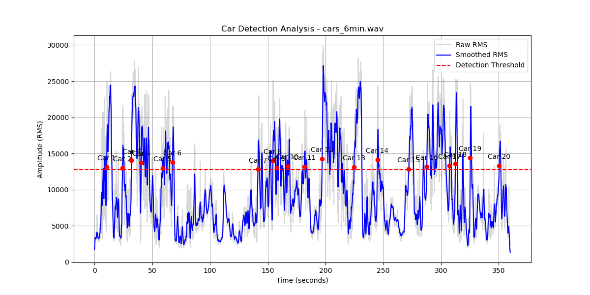 I asked the assistant to run detection for a few minutes while I counted the cars manually, then compared the results. It took only one tuning attempt to reach about 90% accuracy, which remained consistent across three additional tests. It even detected two cars that were very close to each other—something I expected it to struggle with. In one test I could hear a small airplane fly over the microphone, but the system did not classify that sound as a car.