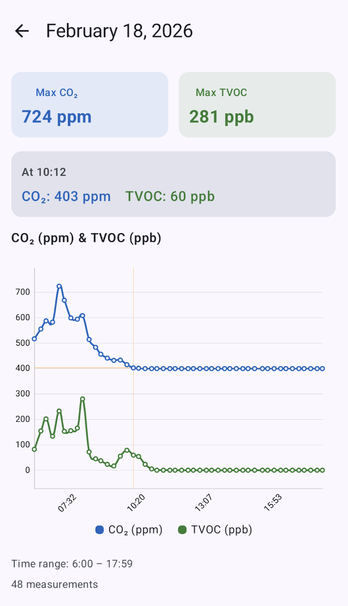 For better visibility and immediate access, I built a mobile app that displays daily values for a selected date. I'll be checking these values alongside my Fitbit sleep score to see whether poor sleep correlates with higher CO2 concentrations.